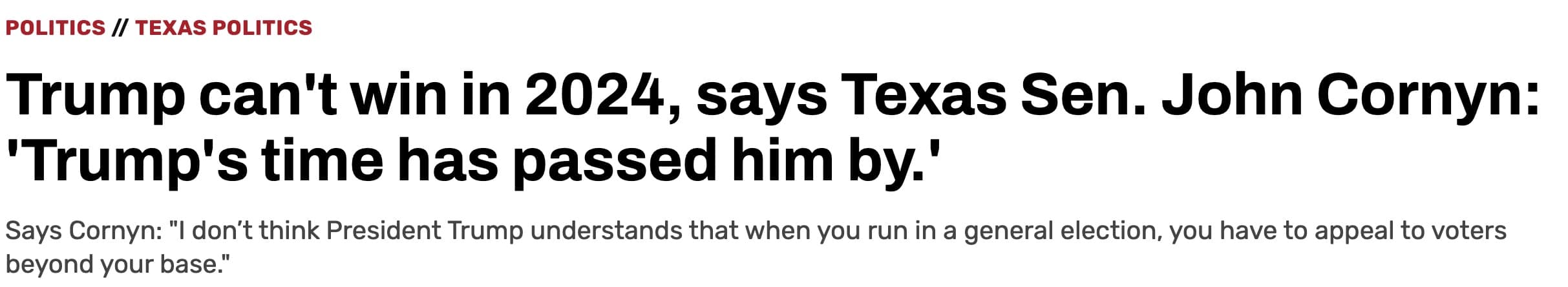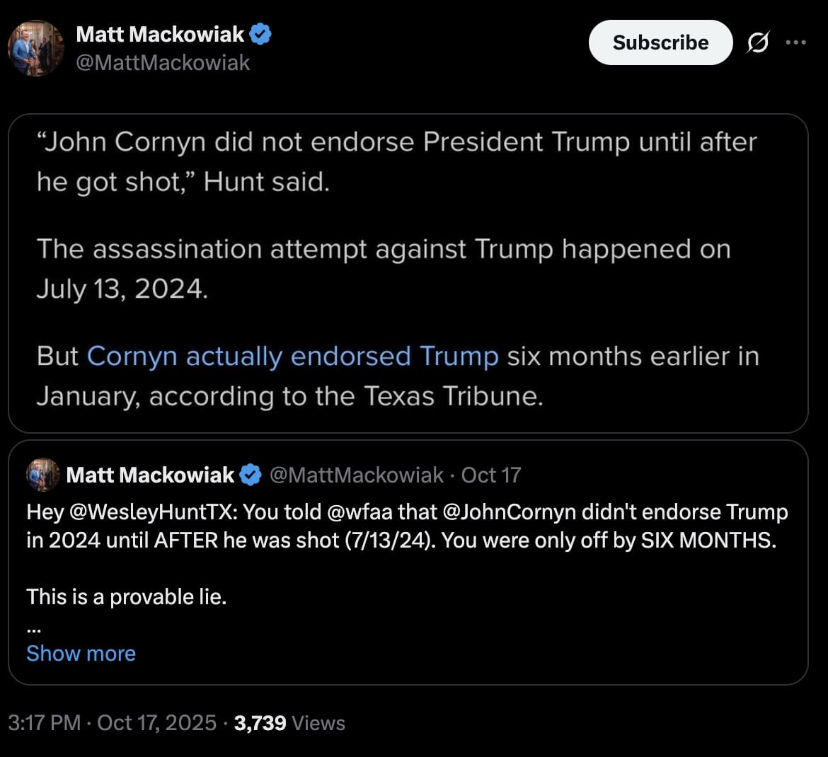 Houston, Texas – A senior staffer on the Cornyn Campaign admits on X that John Cornyn waited until AFTER President Trump dominated the Iowa Caucus before he extended his support for Trump’s presidential bid!![]() View Cornyn’s Senior Staffers’ Social Media Post Here Let’s break it down: Trump Announced: November 15, 2022 Wesley Hunt endorsed: November 15, 2022 Days passed: 0 John Cornyn endorsed: January 23, 2024 Days Passed: 435 That is equivalent to: 37,584,000 seconds OR 626,400 minutes OR 10,440 hours OR 62 weeks and 1 day For months, John Cornyn has been going on social media and running campaign ads statewide claiming that he was endorsed by Trump and is the MAGA candidate for Texas. This new tune that Cornyn is singing has NOT always been his song. Right after President Trump announced his bid for President, to which Congressman Hunt immediately endorsed, John Cornyn said Trump’s “time had passed him by.” ![]() Read More to Learn More Question: Does John Cornyn think that he can fool Texans into believing he is a MAGA Republican? Contact: James Kyrkanides, Lillian Hale Email: James@wesleyfortexas.com, Lillian@wesleyfortexas.com ### |