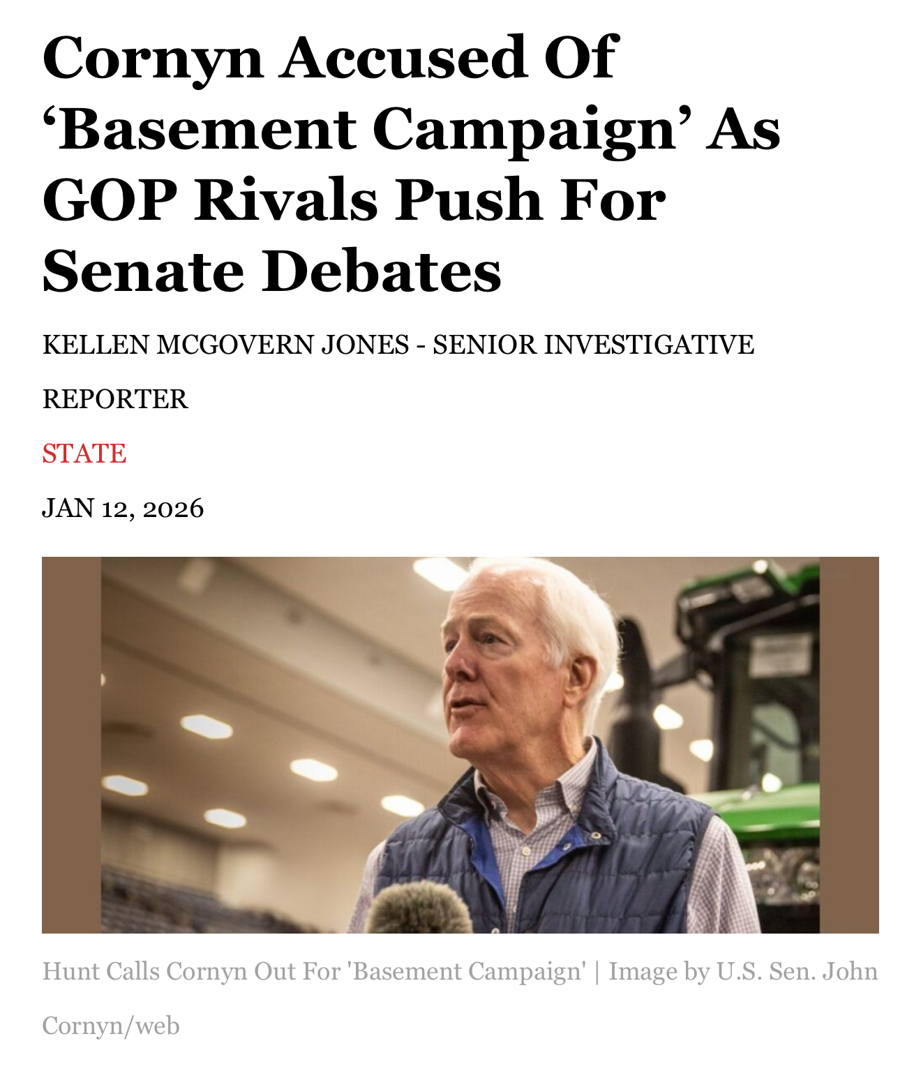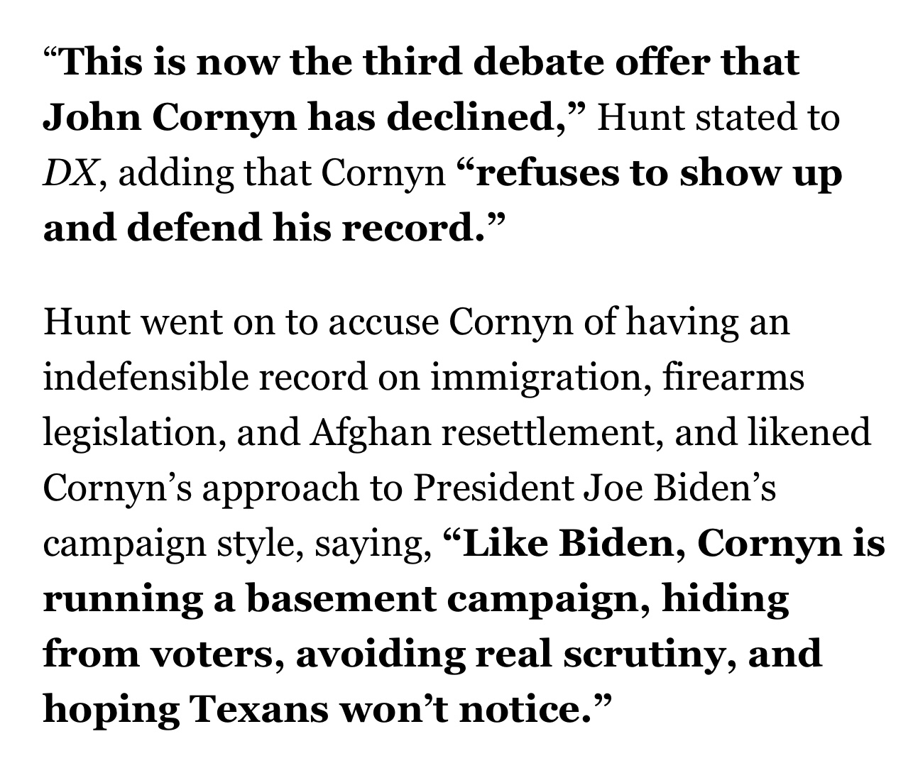 Houston- A recent Dallas Express Exclusive reveals that John Cornyn has denied three debate offers against Wesley Hunt. ![]() View Dallas Express Article Here Since entering this race in early October, Wesley Hunt has been ready to step onto a debate stage with John Cornyn, issuing that challenge publicly and repeatedly. Yet months later, the silence has become deafening. If Cornyn won’t defend his record in front of Texas voters, then he shouldn’t expect to keep asking for their trust. ![]() Leadership isn’t hiding behind silence—leadership is showing up, answering hard questions, and earning their fellow Texans’ vote. John Cornyn has spent $70 million and is still polling in the low 20s as a 24-year incumbent. When will Cornyn realize that he cannot run a campaign from his basement? Texans expect results and momentum, not careless money burning and political games. Contact: James Kyrkanides, Lillian Hale Email: James@wesleyfortexas.com, Lillian@wesleyfortexas.com ### |
