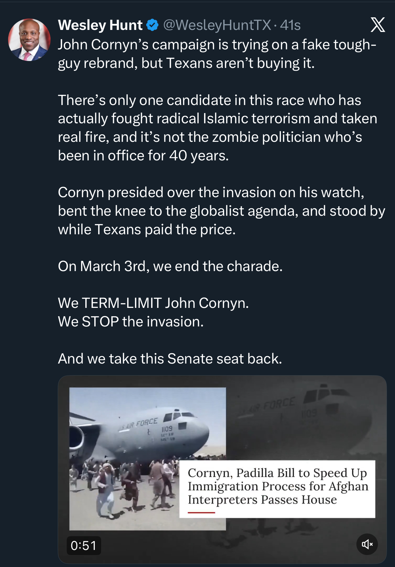 | Houston, TX- Today, the next Senator from Texas, Wesley Hunt, released a new digital ad telling the whole truth about John Cornyn’s record and exposing his phony tough-guy routine for what it is. The ad shows Cornyn’s failures, his accommodation of the globalist agenda in his own words, the Islamification of Texas, and the dangerous consequences Texans have paid during his decades in Washington. Texans know better. ![]() View Social Media Post Here On March 3rd, we term-limit a career politician who has delivered nothing for Texas for nearly half a century, and we take this Senate seat back. Contact: James Kyrkanides, Lillian Hale Email: James@wesleyfortexas.com, Lillian@wesleyfortexas.com ### |