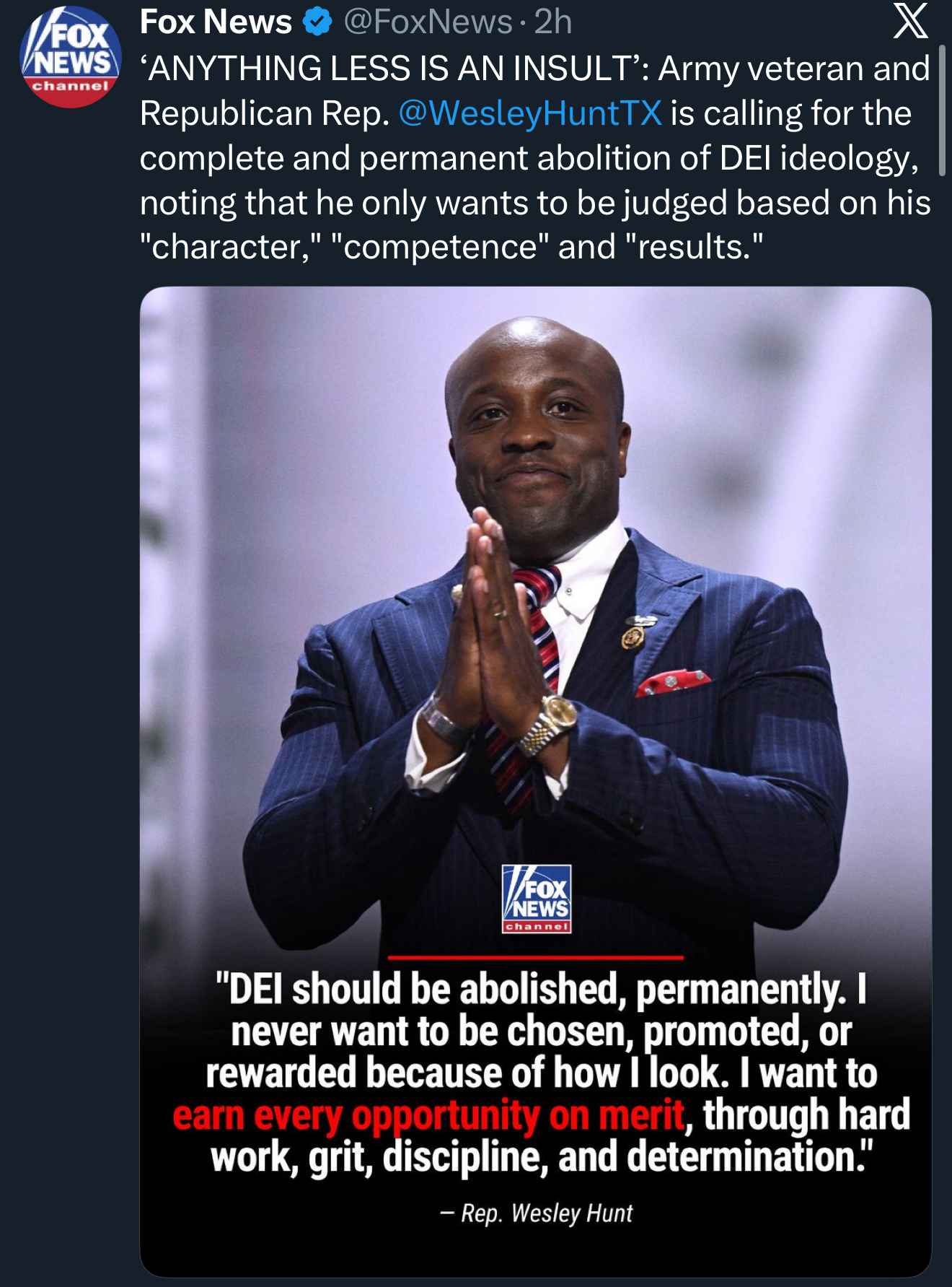 Houston, TX – A Fox News exclusive highlights Wesley Hunt’s call to completely and permanently abolish DEI. ![]() View Fox News Article Here Wesley Hunt represents a majority-white district, and he won his congressional seat in an overwhelming fashion. Texans don’t care about the color of someone’s skin—they care about merit and qualifications. The radical left’s obsession with turning everything into a racial issue is not the American way. 77 million Americans voted to return President Trump to the White House on the promise that he would close the border, secure American sovereignty, and put Americans first, regardless of race, religion, color, or creed. DEI has no place in America. Contact: James Kyrkanides, Lillian Hale Email: James@wesleyfortexas.com, Lillian@wesleyfortexas.com ### |