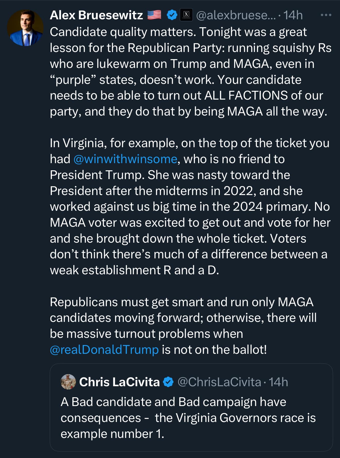 | Houston, Texas – Republicans Lost Last Night — And Texas Will Face the Same Fate if the Party Sticks with Anti-Trump Candidates like John Cornyn. The Republican setbacks in last night’s elections were not a rejection of conservative values or the America First movement. They were a referendum on a failed strategy by GOP leadership that continues to force weak, establishment, anti-Trump candidates onto the ballot. For nearly a decade, Republican victories have been driven by bold, unapologetic, America-First candidates anchored in the movement President Trump built. Yet the establishment continues to push the party back toward the Bush-era brand of Republicanism that the base overwhelmingly rejected in 2016. One of the most glaring recent examples was Winsome Sears — a candidate who despises President Trump and ran with the same uninspired, consultant-driven messaging that has failed us for years. Voters saw right through it. She didn’t energize Republicans, didn’t win independents, and didn’t offer a compelling vision for Virginia. The result? Disaster. If the GOP repeats this mistake in Texas by rubber-stamping another nomination for John Cornyn — a career politician who has spent years distancing himself from President Trump and the America First movement — we should expect the same losing results in the general election. MAGA voters will not turn out for John Cornyn. The message from voters nationwide could not be clearer: Candidates who reject President Trump, belittle the America First movement, or lie about their record to the tune of more than $40 million spent statewide, will lose. John Cornyn represents the very style of Republican “leadership” that voters are rejecting across the country — a weak, consultant-approved approach that fails to inspire voters and fails to fight for Trump. For decades, he has positioned himself as the “safe,” status quo choice. But that model doesn’t win anymore — not in this political era, and not with the stakes this high. Wesley Hunt represents a NEW generation of leadership. “Texas is the heartbeat of the America First movement. Our voters want fighters — not career politicians hiding behind talking points. If Republicans want to win, we must put forward bold, authentic, Trump-Trusted candidates who actually represent the America First Movement. The old playbook is dead.”— Wesley Hunt, Candidate for U.S. Senate (TX) The path forward is clear: Republicans win when we nominate candidates who: • Stand with President Trump without apology or hesitation • Speak boldly and authentically about America First values • Champion Texas sovereignty, energy dominance, border security, and American families • Inspire turnout — not suppress it with uninspired, establishment messaging If GOP leadership insists on pushing the same old Republican brand through the primary — embodied by John Cornyn — then Texas should expect the same losses we witnessed last night. Especially since John Cornyn has a worse approval rating than Ken Paxton among Texas general election voters. America First Wins — When We Let It Texas is not a state that rewards weakness, caution, or political calculation. We reward courage, conviction, and leaders who fight for us. If the Republican Party wants to win in Texas and nationwide — the solution is simple: Run America First candidates: Like WESLEY HUNT. Stop suppressing the movement. Stop protecting the establishment. Let the people choose — and we will win. But you don’t have to take our word for it. Take a look at Team Trump’s statements last night: ![]() Contact: James Kyrkanides, Lillian Hale Email: James@wesleyfortexas.com, Lillian@wesleyfortexas.com ### |